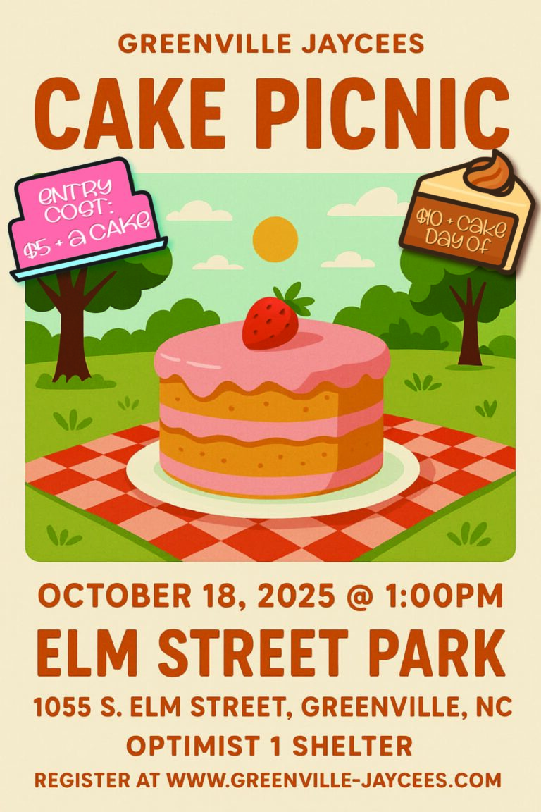 The Greenville Jaycees’ Cake Picnic is a sweet celebration of community where families, friends, and neighbors gather to share homemade cakes, swap stories, and enjoy an afternoon of connection—all while supporting Operation Sunshine. Entry is $5 with pre-registration or $10 the day of the event, and each participant must bring a cake with its ingredients listed on a notecard.